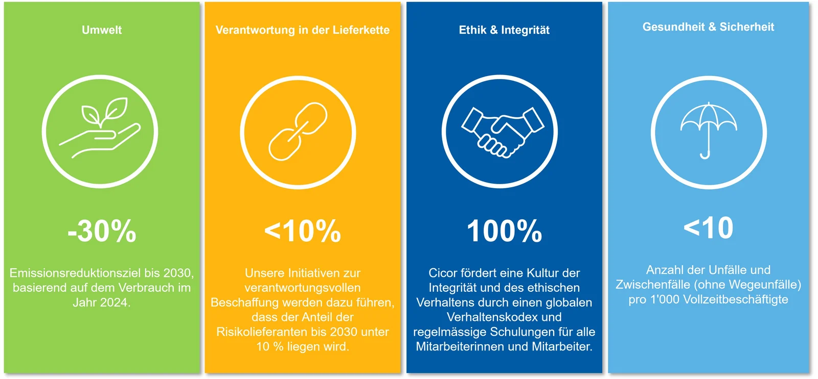 Cicor verankert Nachhaltigkeit und Compliance als Grundprinzipien in allen Unternehmensbereichen. Soziale Verantwortung, Umweltbewusstsein und die Einhaltung gesetzlicher Vorschriften sind fest in der Unternehmensstruktur sowie in den strategischen Schwerpunkten der Cicor Strategie 2028 integriert. Dies zeigt sich auch in unserer Nachhaltigkeitsstrategie, die klare Prioritäten und messbare Ziele definiert.