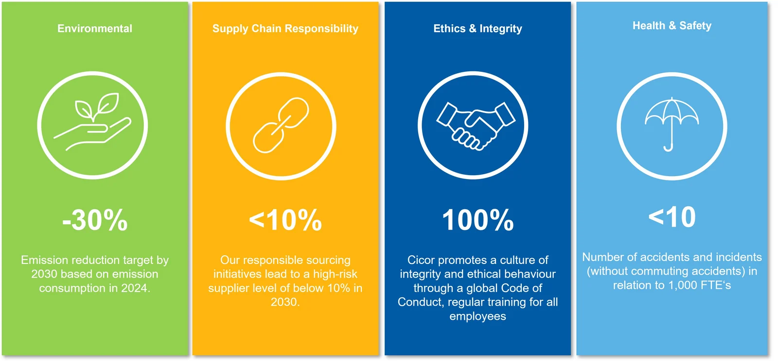 Cicor integrates sustainability and compliance principles across its entire business. Social responsibility, environmental stewardship and regulatory compliance are deeply embedded in our corporate structure and strategic focus areas as part of the Cicor 2028 strategy. This is reflected in our sustainability strategy, which defines clear priorities and measurable goals.