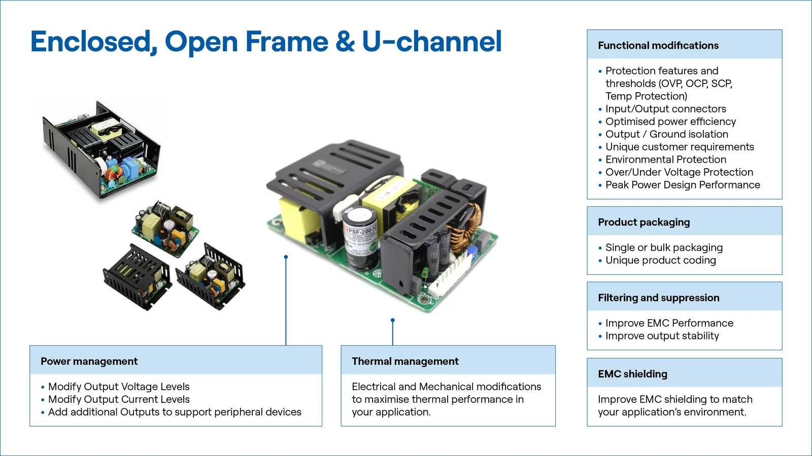 Industrial power solutions often require special features such as peak output power for short periods and selected output connectors for wall-mounted or desktop products.